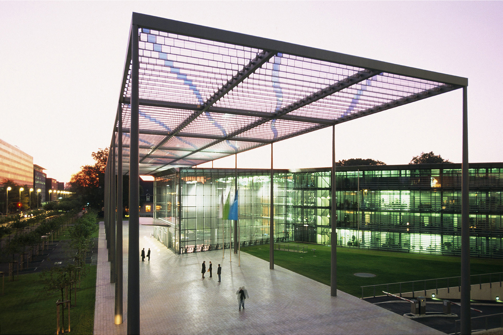 Rückwärtig öffnet sich die Konzernzentrale dem Carl-Duisberg Park. Die Fassade ist als zweischalige Glasfassade ausgebildet. Zwischen den Fassadenschichten befinden sich voll-automatisch gesteuerte Sonnenschutz- lamellen. Die Lamellen sind perforiert und gewähren auch im geschlossenen Zustand Durchblicke zum Park. Foto: Bayer AG |
