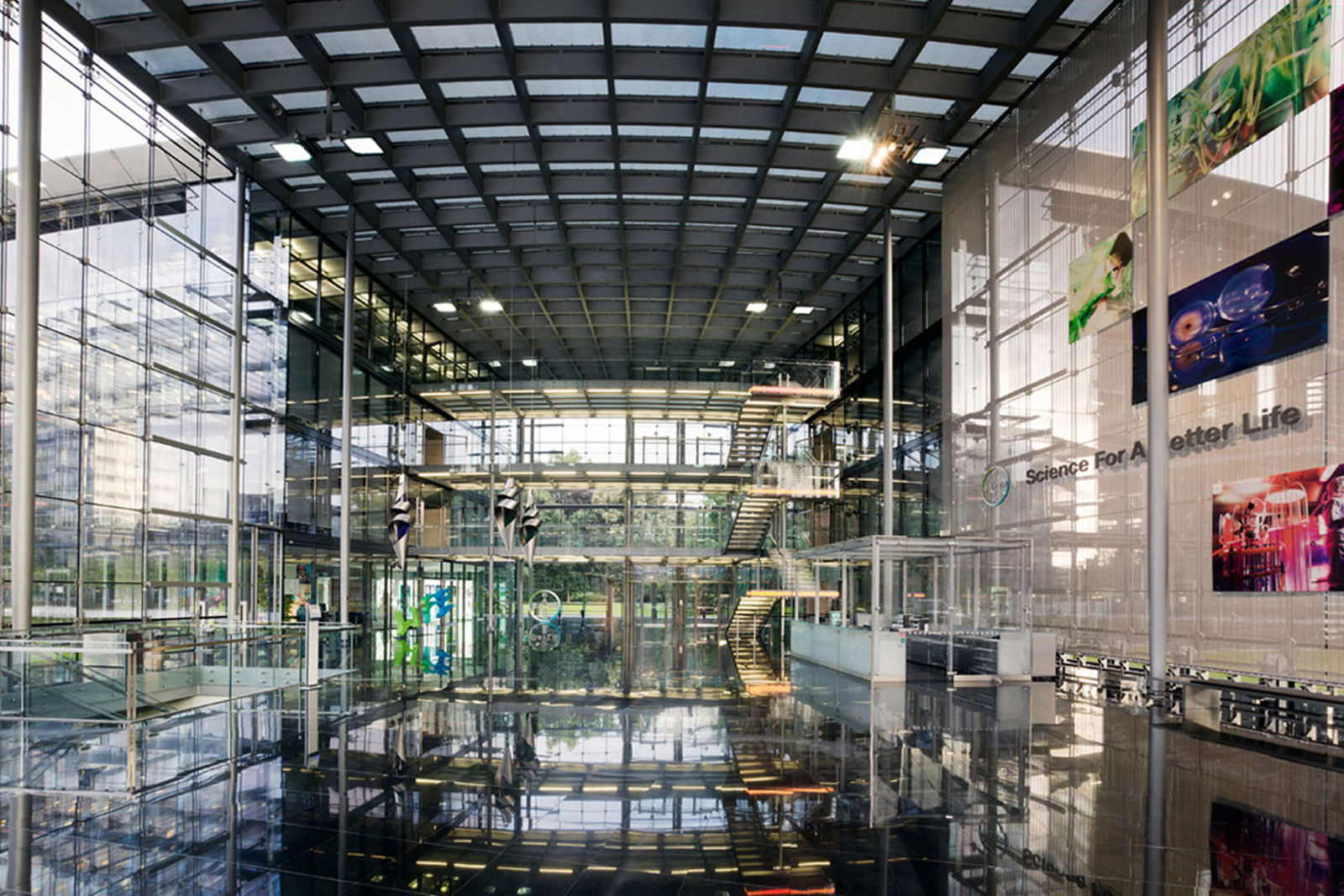 Die hohe gläserne Eingangshalle ist mit einer vollkommen transparenten Glas-Seilfassade ausgestattet. Durch vorgespannte Seile zur Glasaufhängung benötigt die Fassade keine Pfosten oder Träger. Edelstahlgewebe dient als Blendschutz gegen die niedrig stehende Sonne. Das gleichmässig schimmernde Gewebe erlaubt jedoch - wie eine Gardine - eine vollkommene Durchsicht nach aussen. |