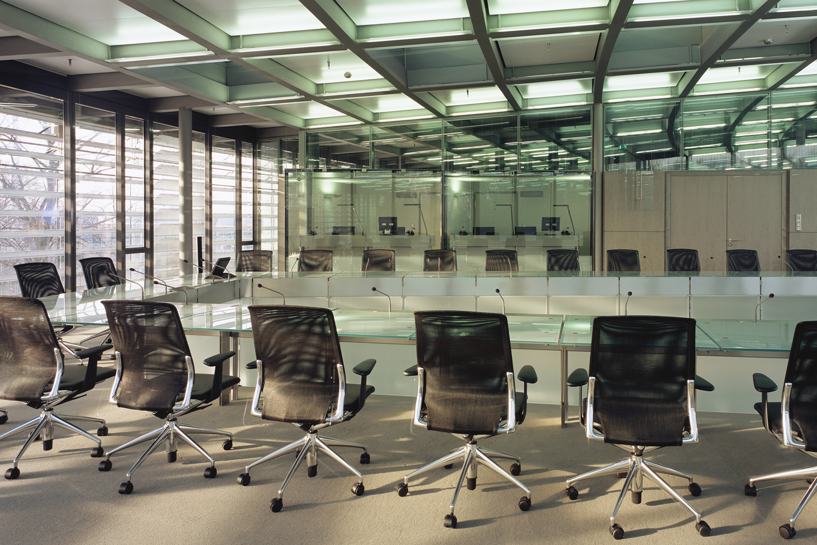 Konzernzentrale Bayer AG, Leverkusen Die Konferenzräume sind mit Edelstahl- Glastischen ausgestattet. In die Möbel und Wände sind die neuesten medientechnishen Ausstattungen integriert. Die Sonnenschutzlamellen der Doppelfassade sorgen für blendfreies, gleichmässiges Tageslicht, ohne den Ausblick nach aussen zu behindern. Foto: DWH Deutsche Werkstätten Hellerau. |