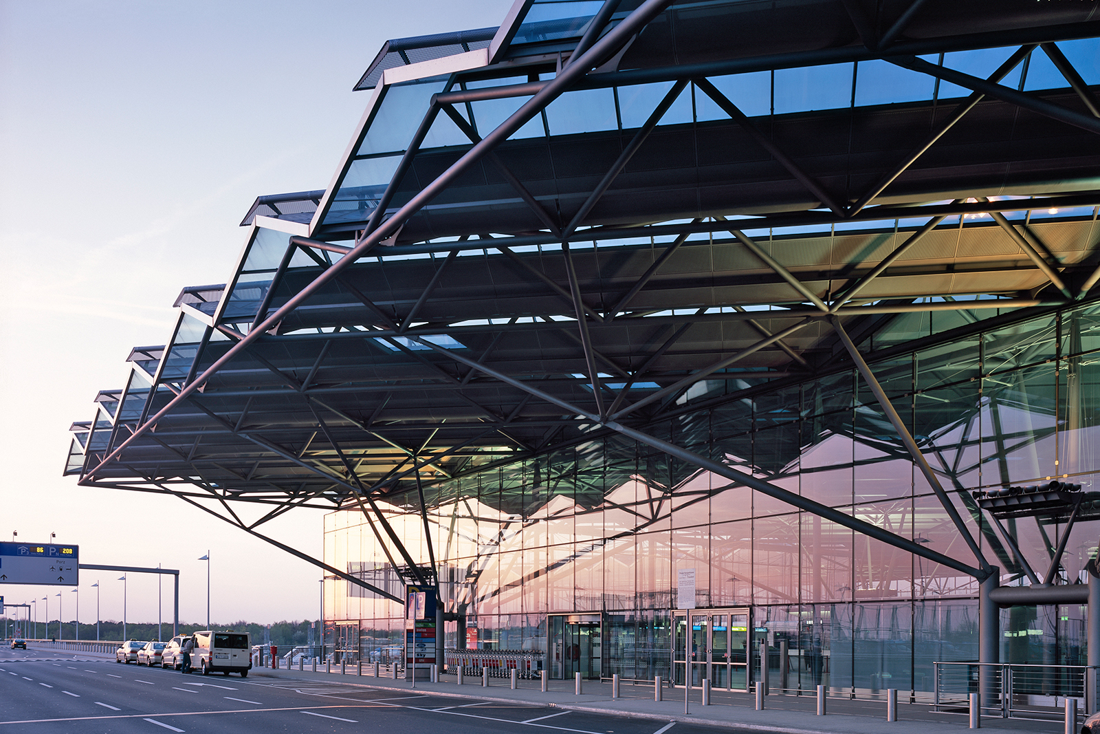 Die Vorfahrtstrasse ist durch einen grosszügigen Dachüberstand von 15m für die abfliegenden Passagiere regengeschützt. Das Tragwerk tritt aus der Aussenfassade expressiv hervor. Foto: Andreas Wiese, Düsseldorf |