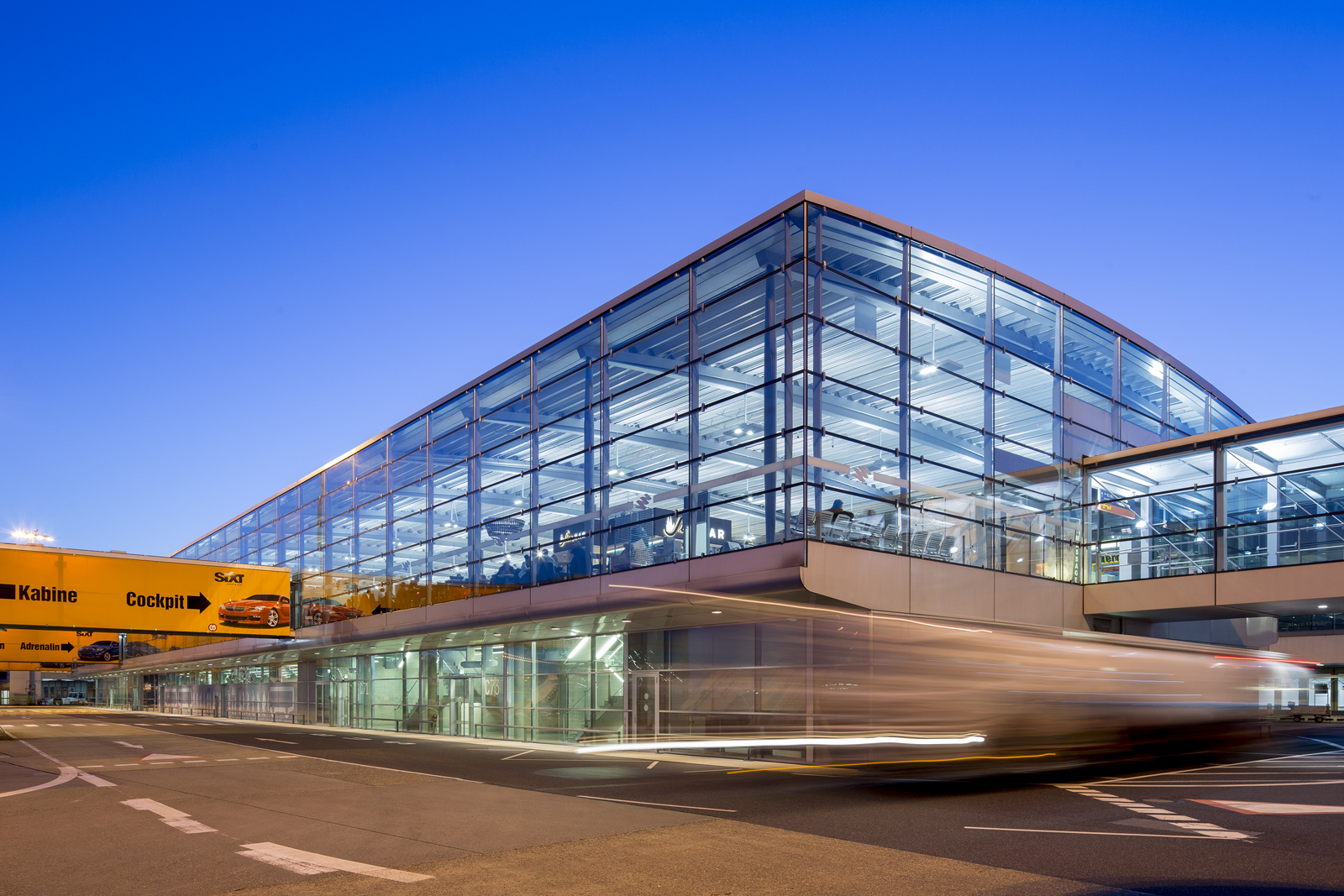 130m lang erstreckt sich der Erweiterungsbau des Terminal 1 auf dem Vorfeld. Um das 30m tiefe Gebäude im Inneren immer hell und lichtdurchflutet zu halten, wurde die Fasade als komplette Glashülle gewählt. So sind nicht nur Abflughalle, sondern auch alle Büro- und Nebenbereiche maximal mit Tageslicht ausgestattet. Foto: Andreas Wiese, Düsseldorf |