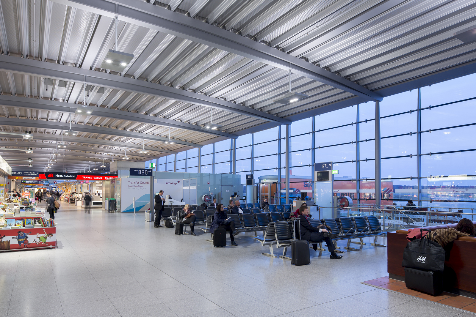 Die Wartebereiche sind offen und flexibel gehalten. Die Boardingschalter wurden mit den Gateeingängen völlig neu konzipiert.Sie sind klein und effizient, mit schlichtem Edelstahl verkleidet. Die schimmernden Oberflächen nehmen die Gestalt und Faszination der Flugzeugflügel auf dem Flugfeld vorweg. Foto: Andreas Wiese, Düsseldorf |