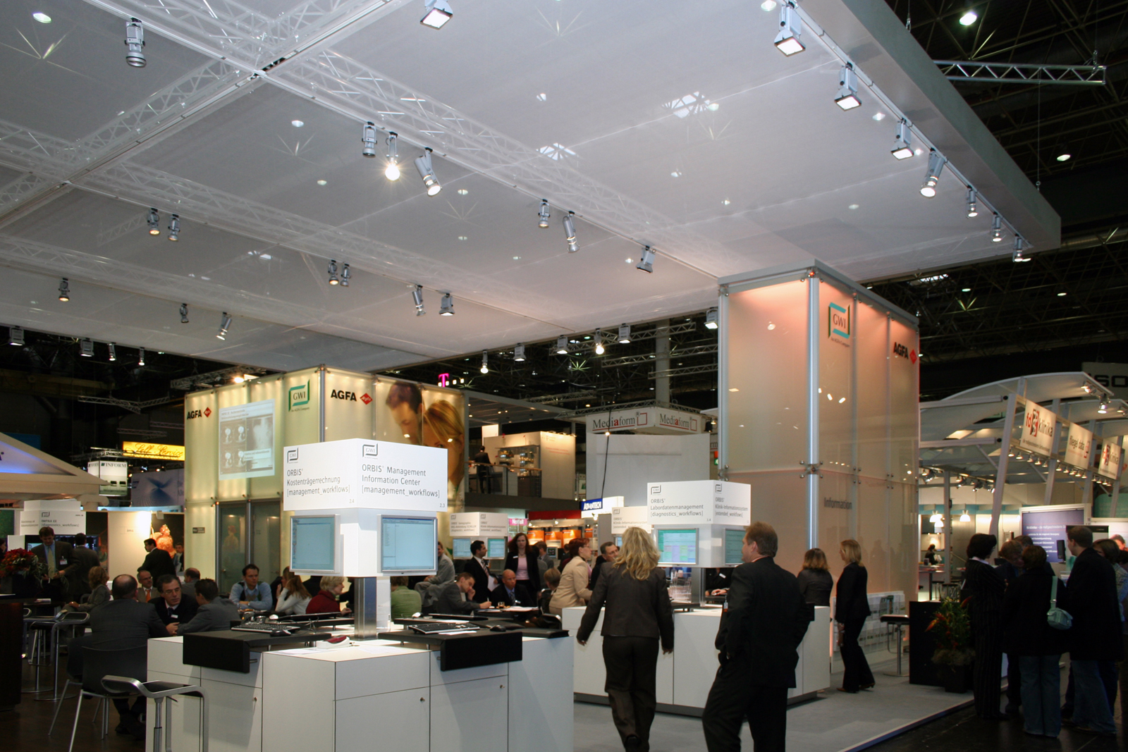 Der Messestand besteht aus einem modularen Konstruktionssystem. Wie Teile eines Baukastens können für verschiedene Messen und Standgrössen die Elemente jedesmal neu konfiguriert werden. Der erste Stand wird auf der Medica November 2005 in Düsseldorf errichtet. Pro Jahr folgen bis zu 10 Messen im In- und Ausland. |