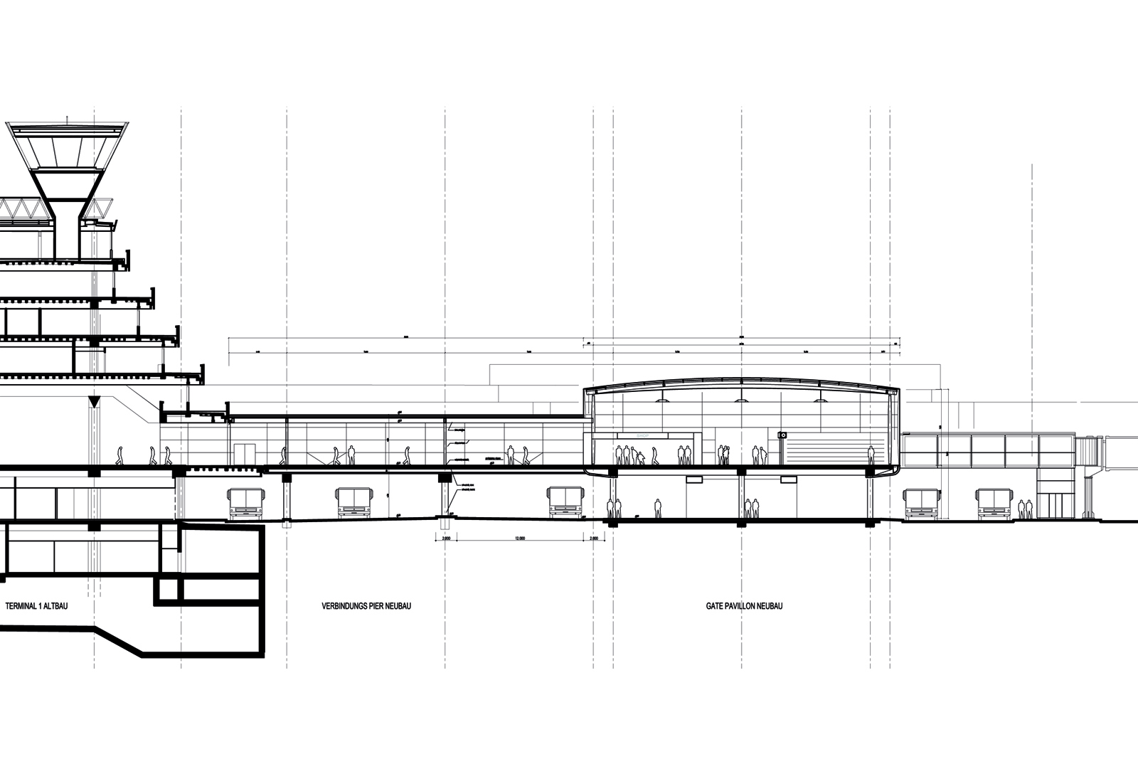 Gebäudeschnitt durch Terminal 1 Trotz der grossen Gebäudetiefe ist durch die Architektur der Glasfassaden überall Ausblick und hervorragende Orientierung gegeben. |